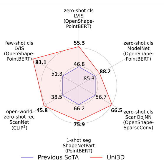 - task: zero-shot classification, few-shot classification, open-world understanding, part segmentation์์ ์๋ก์ด ๊ธฐ๋ก์ ๋ฌ์ฑํจ