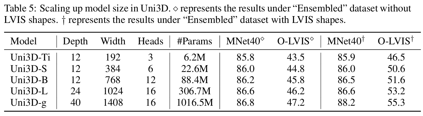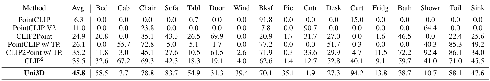 - ๊ทผ๋ฐ uni3d๋ ์ค์ธ๊ณ ๋ฐ์ดํฐ๋ฅผ ํ๋ฒ๋ ๋ณด์ง ์๊ณ ํฉ์ฑ ๋ฐ์ดํฐ๋ง์ผ๋ก ํ๋ จํ๋๋ฐ ๊ฐ์ฅ zero-shot ์ฑ๋ฅ์ด ๋์ โ ์ค์ธ๊ณ 3D generalization ๋ฅ๋ ฅ์ ๊ฐ์ถ๊ณ ์์