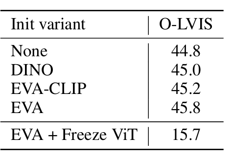 - ์ด๊ธฐํ x, 2d pretrained vit (DINO, EVA), ๋ฉํฐ๋ชจ๋ฌ clip (EVA-CLIP), EVA + freeze vit - EVA๋ก ์ด๊ธฐํํ๋ backbone์ freeze, fine-tuning ์์ด ์ฌ์ฉ