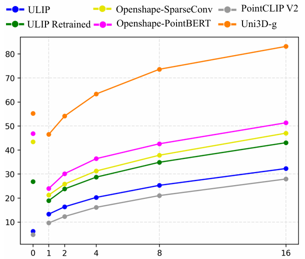 - ๊ฒฐ๊ณผ์ ์ผ๋ก, ๋ชจ๋ few-shot ์ค์ ์์ uni3d๊ฐ ๋ค๋ฅธ ๋ฒ ์ด์ค๋ผ์ธ ๋ชจ๋ธ์ ํฐ ํญ์ผ๋ก ๋ฅ๊ฐํจ