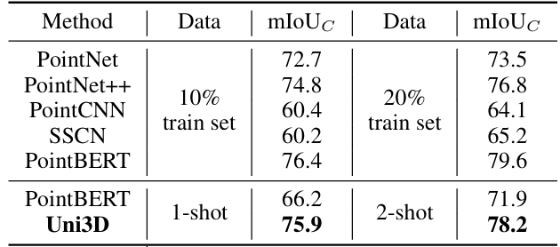 - ์ฆ, ๋ค๋ฅธ ๋ชจ๋ธ๋ค์ 10~20%์ ๋ผ๋ฒจ ๋ฐ์ดํฐ๋ฅผ ํ์๋ก ํ๋ ์์ค์ ์ฑ๋ฅ์ uni3d๋ 1-2 shot ๋ง์ผ๋ก ๋ฌ์ฑํจ