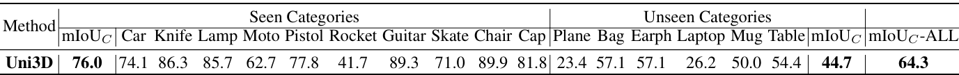 - โUni3D๋ ์ผ๋ถ part ์ด๋ฆ์ ํ์ต ์ค์ ๋ณด๊ณ , ๋๋จธ์ง part ์ด๋ฆ์ ๋จ ํ ๋ฒ๋ ๋ณธ ์ ์์ด ํ ์คํธ ์ ์ฒ์ ๋ณธ๋คโ